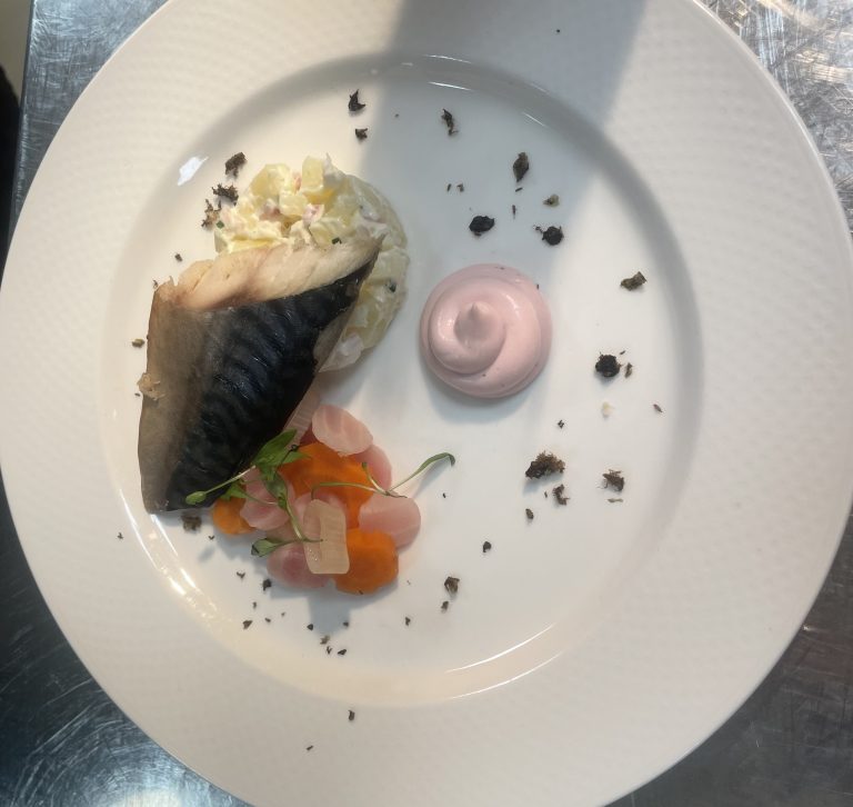 Smoked Mackerel, Potato & chive salad with a beetroot Crème Fraiche